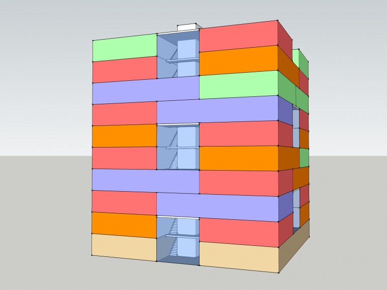 Studie van compact woonblok met grote variatie van indelingsmogelijkheden. Compact en flexibel. Op zoek naar woonvormen voor de komende eeuw. We kunnen ons nu eenmaal niet veroorloven iedereen naast elkaar te laten wonen. Bij elkaar is belangrijk, met voldoende ruimte om ook gezamenlijk een sociale structuur op te bouwen. Een verticale straat als het ware. Met 4 eenheden per bouwlaag kun je op deze manier 36 eenheden bouwen. Het skelet is geen belemmering voor de indeling. De gevel kan vervangen worden. Verdere uitwerking? Het kan nog alle kanten op.